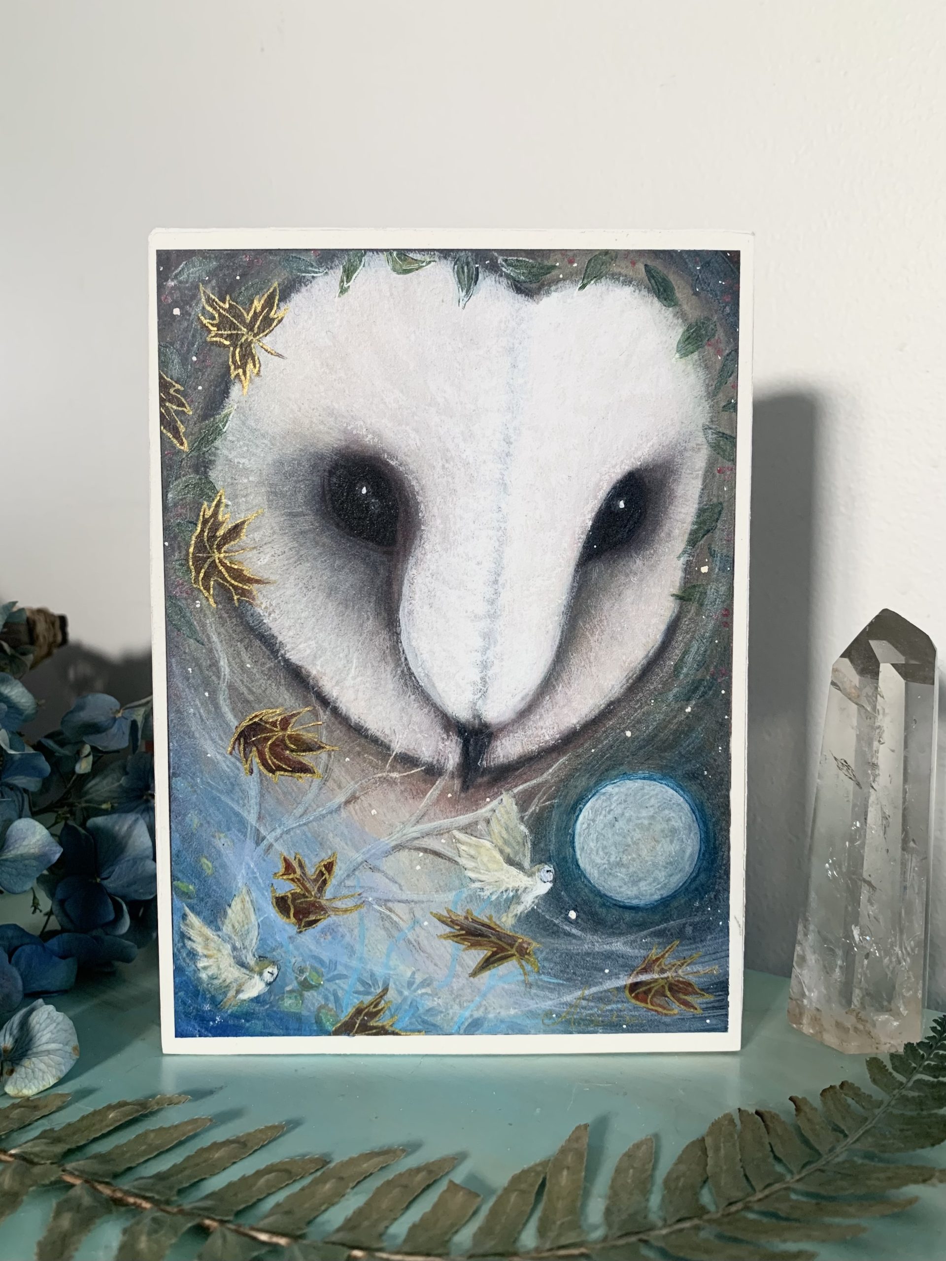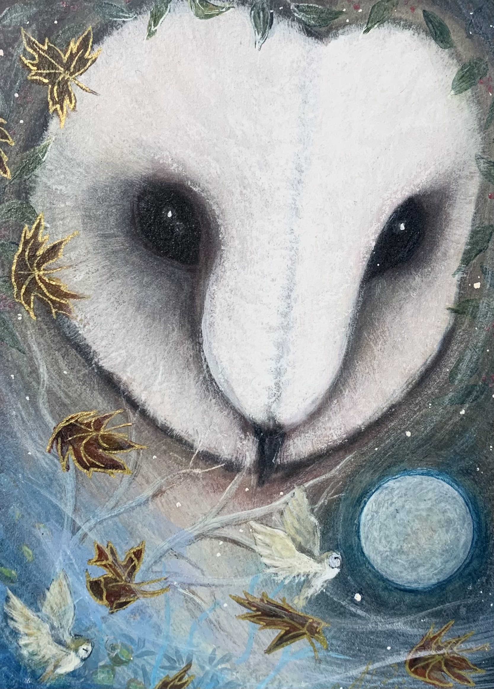 Description: owls flying with blowing gold lined autumn leaves. A full moon is thier destination, a large owl face is the sky.