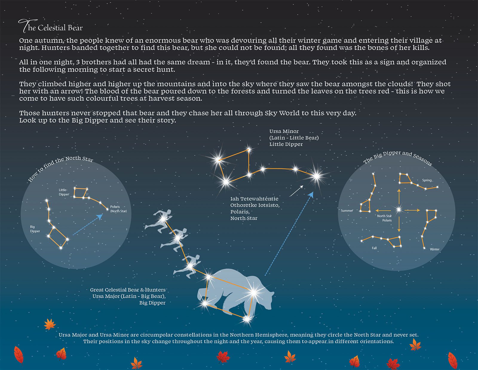 The stories shared are rooted in Sasha’s journey of research and relationship and weaves Haudenosaunee ways of knowing with astronomical science. In 2021, Sasha began her journey through the Milky Gateway and on to Spirit World. Through love and resilience, her sister Samantha embraced the responsibility of lovingly carrying forward her work.