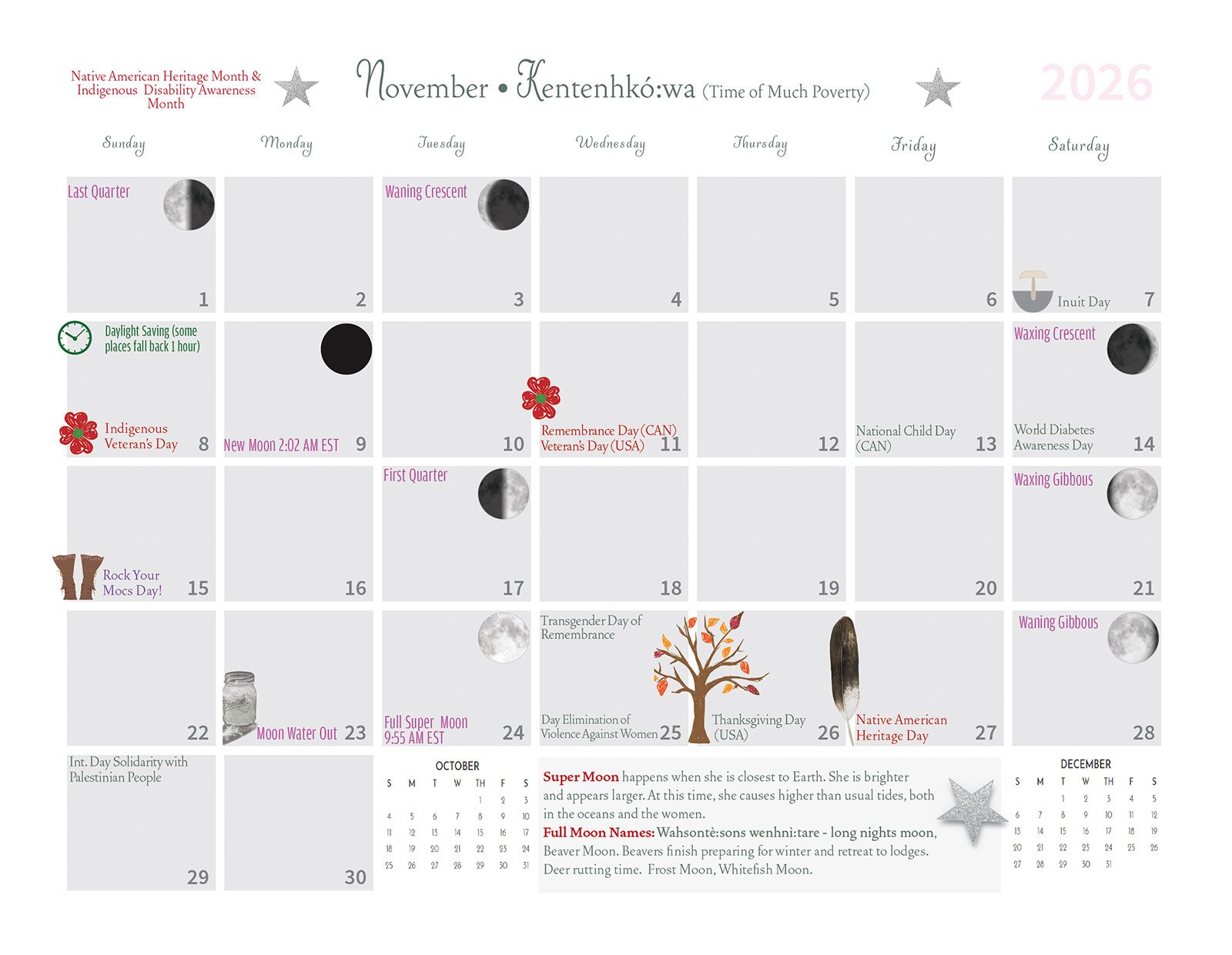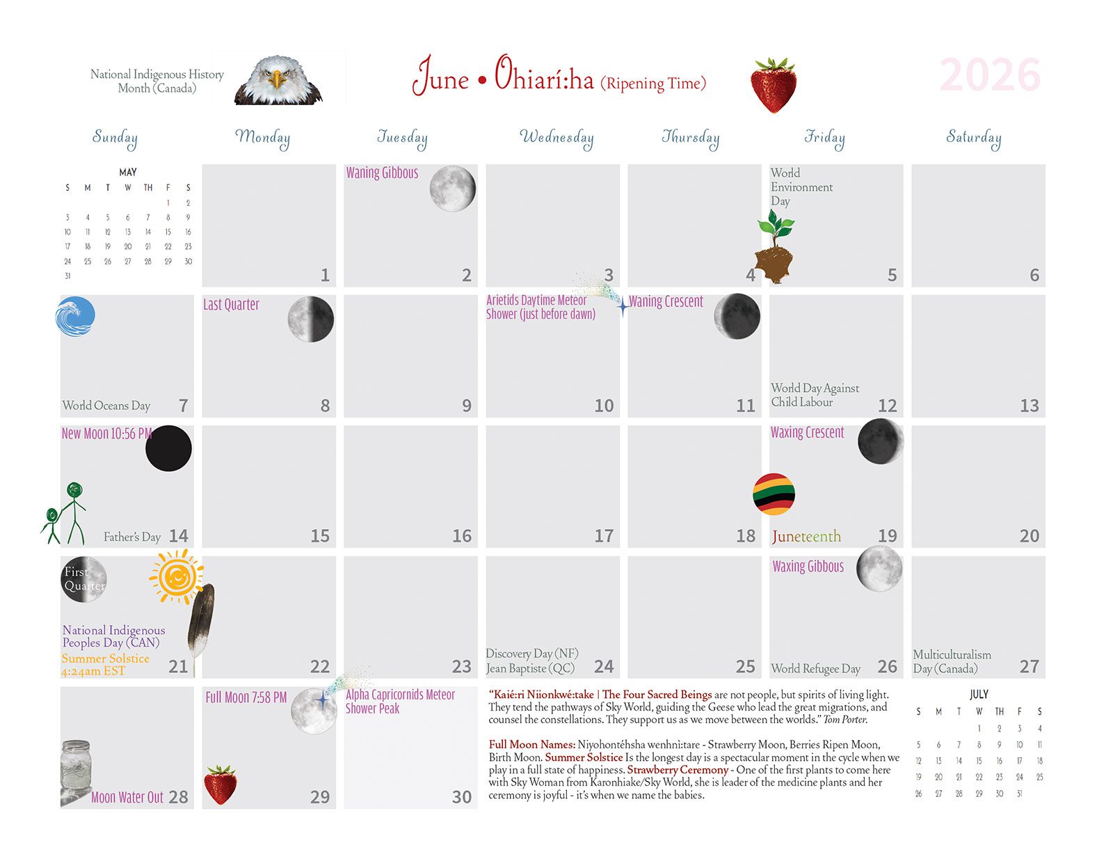 Each month is full of mindfulness and teachings. It includes Moon times, Moon names, Moon water reminders, seasonal ceremonies and Indigenous dates and events like Orange Shirt Day and MMIW awareness.
